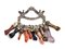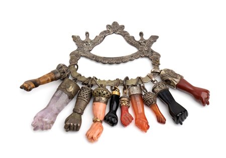 Altezza x larghezza: 13 x 9 cm. Peso complessivo lordo: 138 gr. 10 talismani con montatura in argento decorata con fenici e foglie, raffiguranti 10 mani che compiono il gesto "figa".