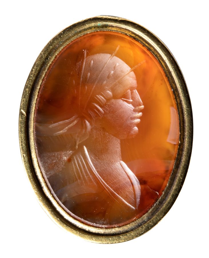 composto da tre sigilli rispettivamente incisi in ametista, corniola ed agata, raffiguranti differenti profili di figure maschili.