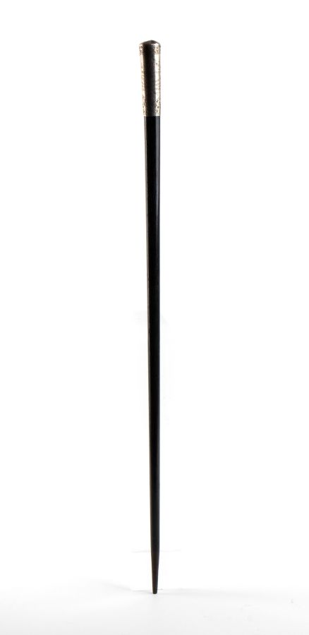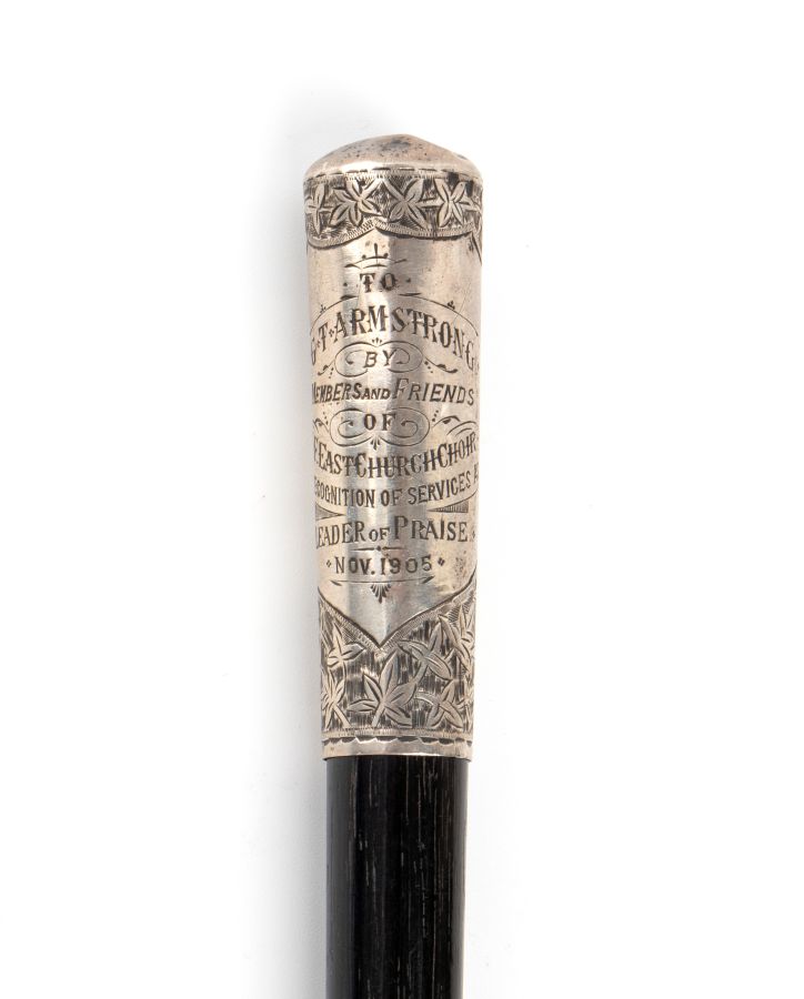 Lunghezza: 52 cm. Peso: 72 gr. fusto in legno ebanizzato con impugnatura in argento inciso con l'iscrizione "TO G T ARMSTRONG BY MEMBER SAND FRIENDS OF U.F.EASTCHURCHCHOIR. IN RECOGNITION OF SERVICES AS LEADER OF PRAISE NOV. 1905". Classificazione dello stato di conservazione: **** buono.