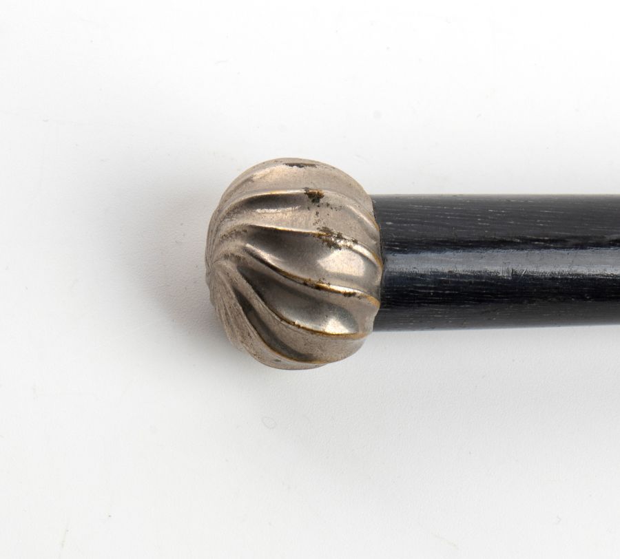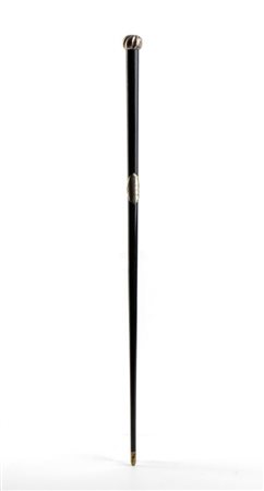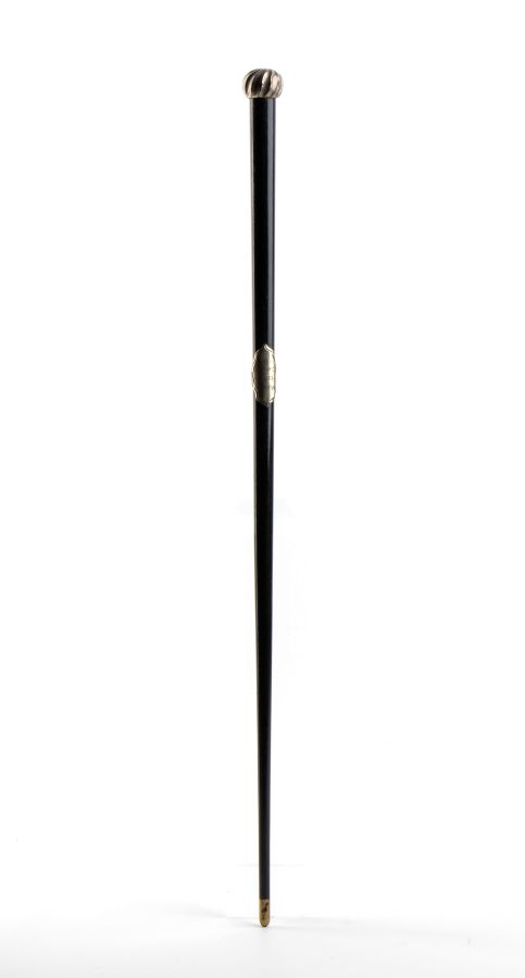 Lunghezza: 52 cm. Peso: 74 gr. fusto in legno ebanizzato con impugnatura a pomolo sagomato, cartiglio centrale e terminale in metallo argentato.
