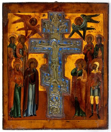 Icona russa Stauroteca con croce in bronzo e smalti XIX secolo Altezza x larghezza x profondità: 45 x 37 x 2,5 cm.