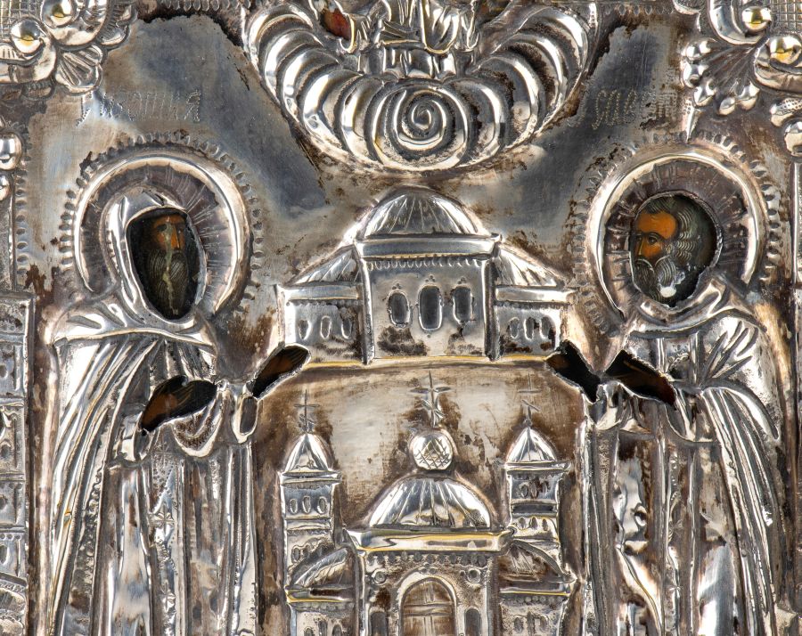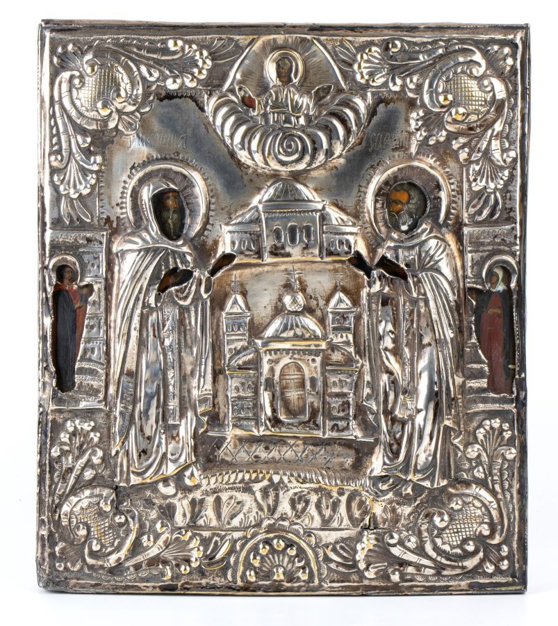 Icona russa con santi Tula (?) XIX secolo Tempera su tavola Altezza x larghezza x profondità: 33 x 29 x 3 cm. Peso 1695 gr.
