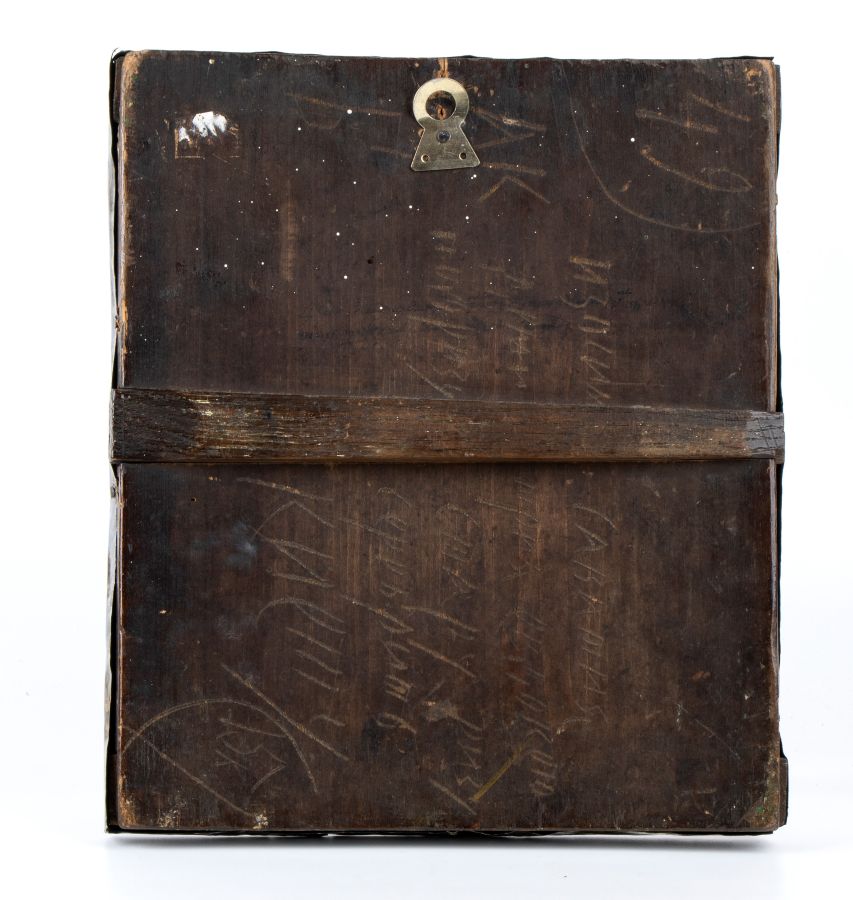 Tempera su tavola Altezza x larghezza x profondità: 33 x 29 x 3 cm. Peso 1695 gr. tempera su tavola con riza in rame argentato al centro della quale troviamo la città di Gerusalemme; ai lati i santi e nella parte superiore il Cristo pantocratore.