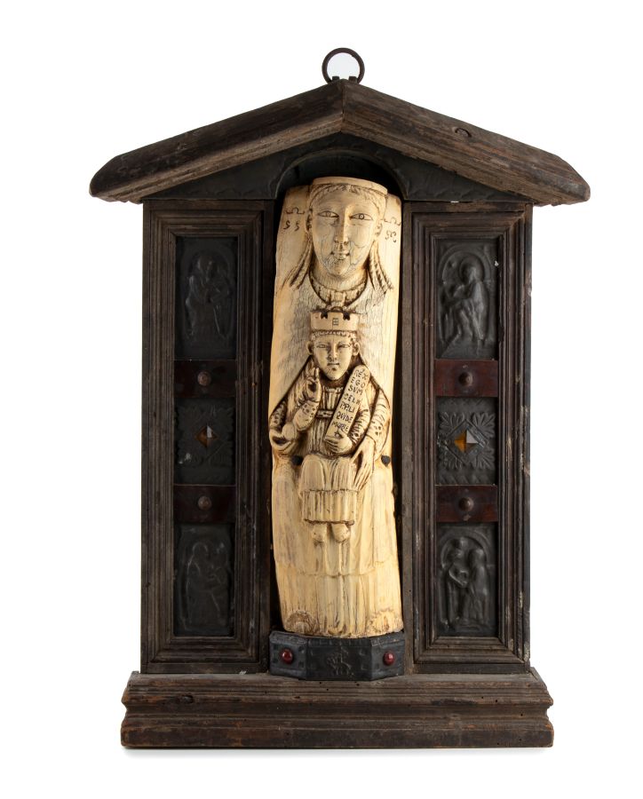 Madonna con Bambino in avorio in stile Romanico Bizantino XV-XVII secolo Altezza x larghezza scultura: 49 x 13 cm. Altezza x larghezza complessiva: 70,5 x 46,5 cm. Peso complessivo: 10100 gr.