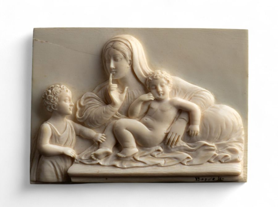 Altezza x larghezza x profondità: 7 x 9,7 x 0,7 cm. Peso: 39 gr circa. Scultura in avorio di elefante (Elephas maximus Linnaeus, 1758 o Loxodonta africana Blumenbach, 1797), intagliata a rappresentare la Vergine Maria semidistesa, mentre tiene tra le braccia il Bambino Gesù. Con il volto girato verso sinistra, Maria sembra rivolgersi a San Giovanni. La scena richiama le raffigurazioni di vita quotidiana.
