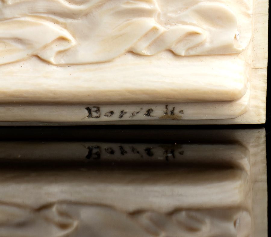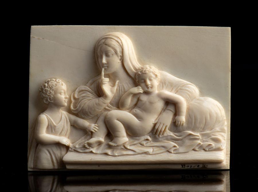 BORRELLI - Placca italiana in avorio raffigurante la sacra famiglia Fine XIX, inizio XX secolo Altezza x larghezza x profondità: 7 x 9,7 x 0,7 cm. Peso: 39 gr circa.