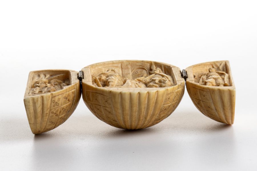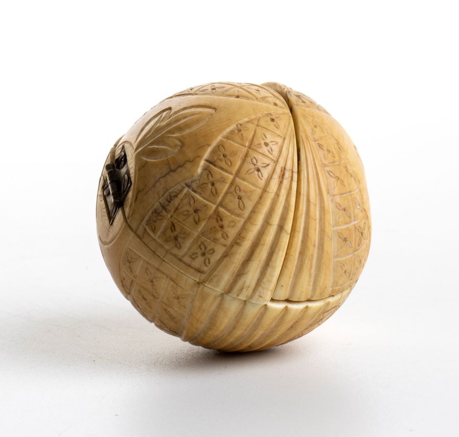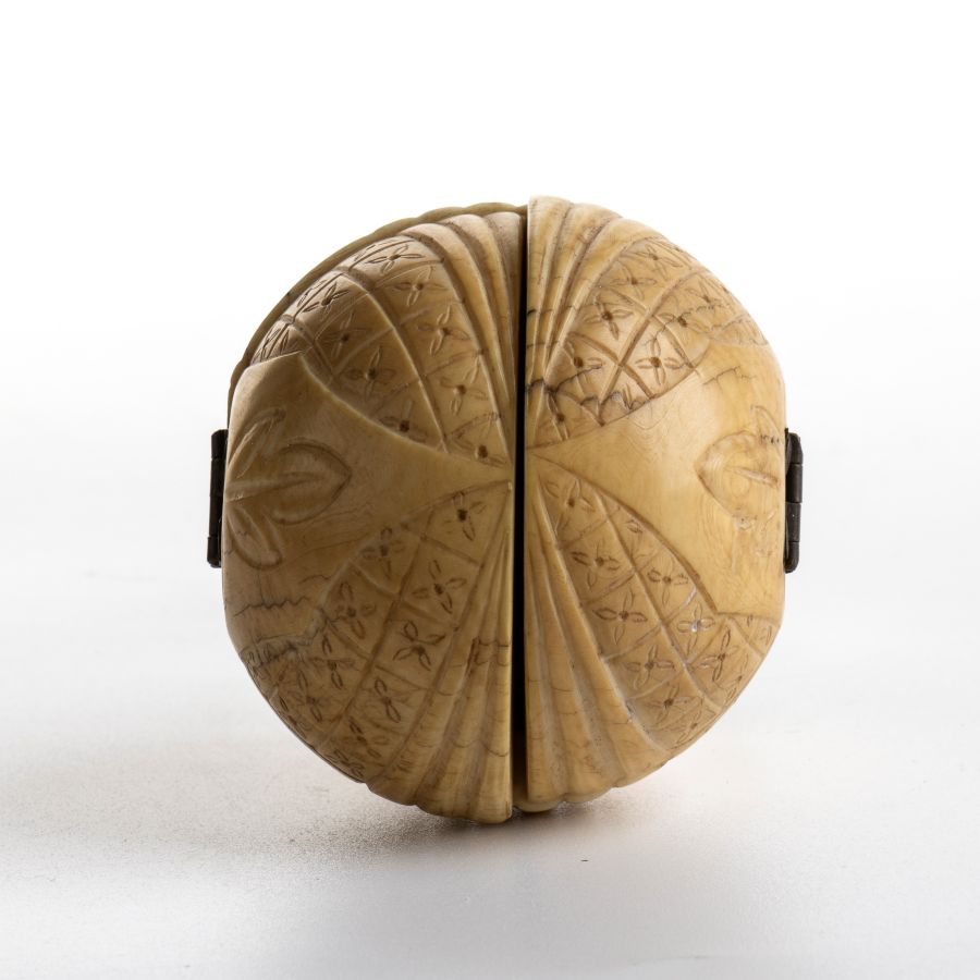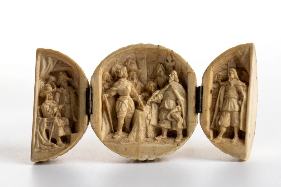 Trittico a sfera pieghevole in avorio Francia, Dieppe (?), XIX secolo Diametro x larghezza aperto: 5,4 x 10 cm. Peso: 115 gr