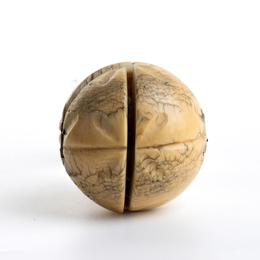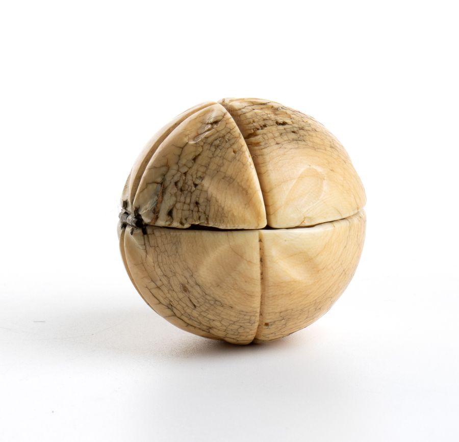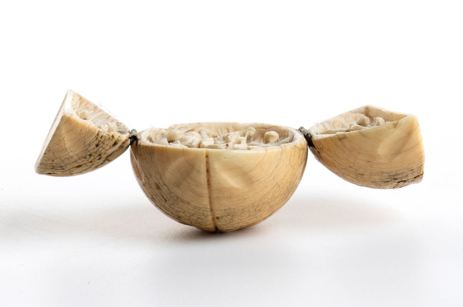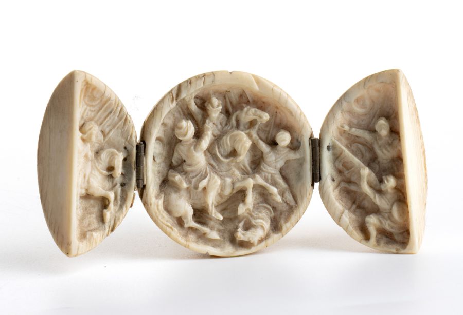 Trittico a sfera pieghevole in avorio Francia, Dieppe (?), XIX secolo Diametro x larghezza aperto: 5,2 x 11 cm. Peso: 116 gr