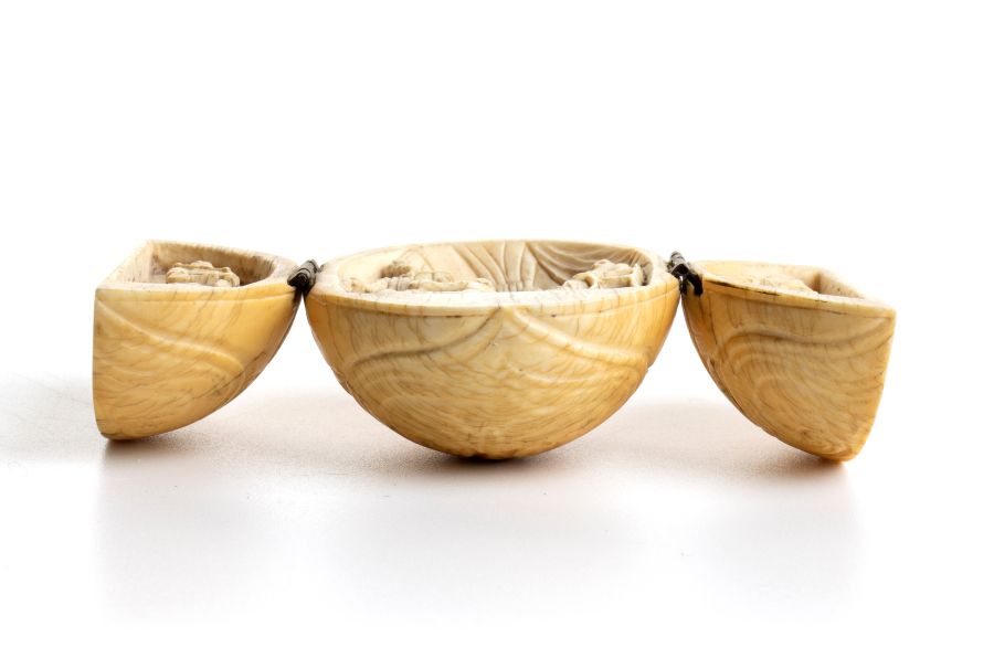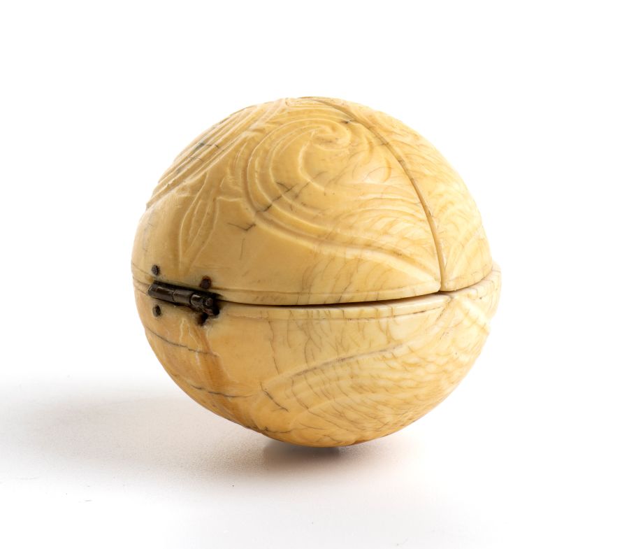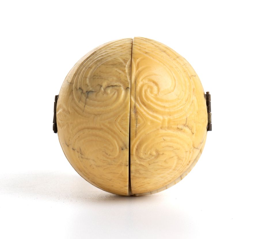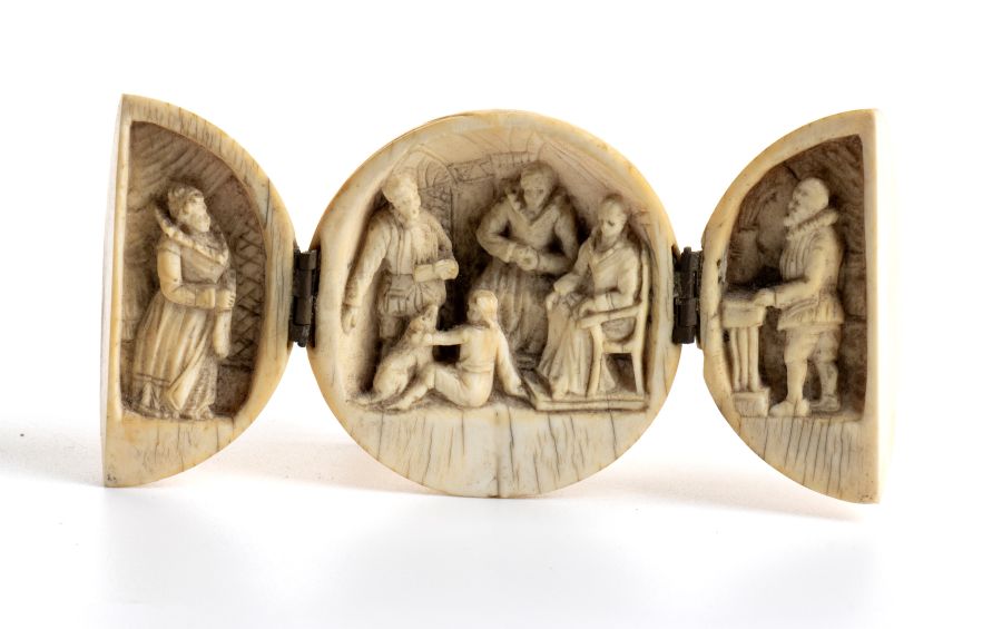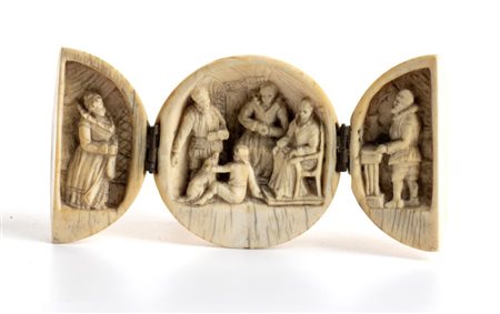 Trittico a sfera pieghevole in avorio Francia, Dieppe (?), XIX secolo Diametro x larghezza aperto: 5,2 x 10,2 cm. Peso: 98 gr