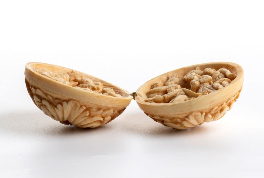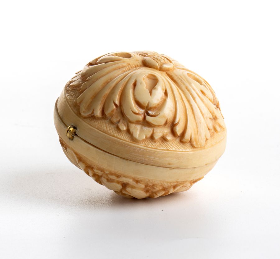 I dittici sferici apribili furono prodotti essenzialmente in Francia e in Germania tra il XVIII e il XIX secolo, riprendendo la tradizione dei Prayer nuts. Il termine inglese Prayer nut o Prayer beads deriva dall'equivalente olandese gebedsnoot, ed è entrato nell'uso comune nel XVIII secolo. L'uso della parola "noce" potrebbe derivare dal fatto che alcune perle erano effettivamente intagliate da noci o noccioli, pratica diffusa nella Germania meridionale medievale. Sono tipicamente apribili a metà e intagliati all'interno di scene religiose cristiane o scene storiche altamente dettagliate e intricate. Le loro dimensioni variano tra i 2 e i 5 cm di diametro, per lo più della stessa forma, decorati all'esterno con trafori gotici intagliati e teste di fiori. Spesso contengono scene centrali raffiguranti episodi della vita di Maria o della Passione di Gesù e, in alcuni casi, contengono iscrizioni intagliate solitamente legate al significato della narrazione. Questo lotto, accompagnato da certificato CITES e da perizia tecnica rilasciata dal Ce.S.Ar. Centro Studi Archeometrici, è disponibile per la vendita solo con spedizioni all’interno della Comunità Europea. Classificazione dello stato di conservazione: **** buono.