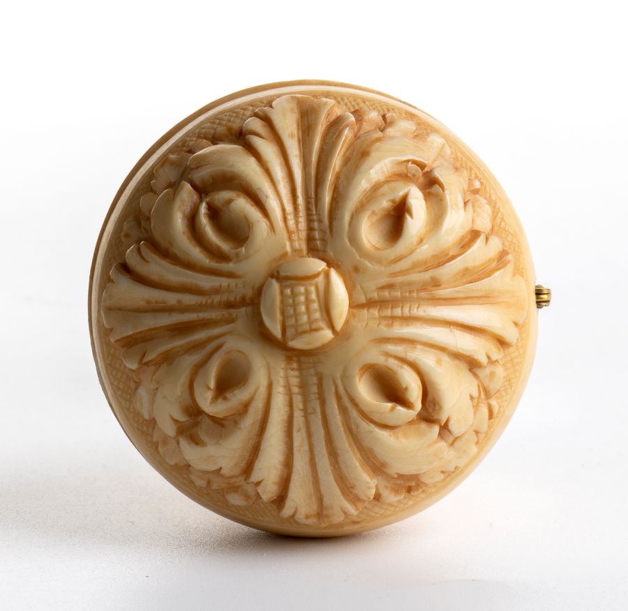 Dittico a sfera pieghevole in avorio Francia, Dieppe (?), XIX secolo Diametro x larghezza aperto: 6 x 11,7 cm. Peso: 123 gr