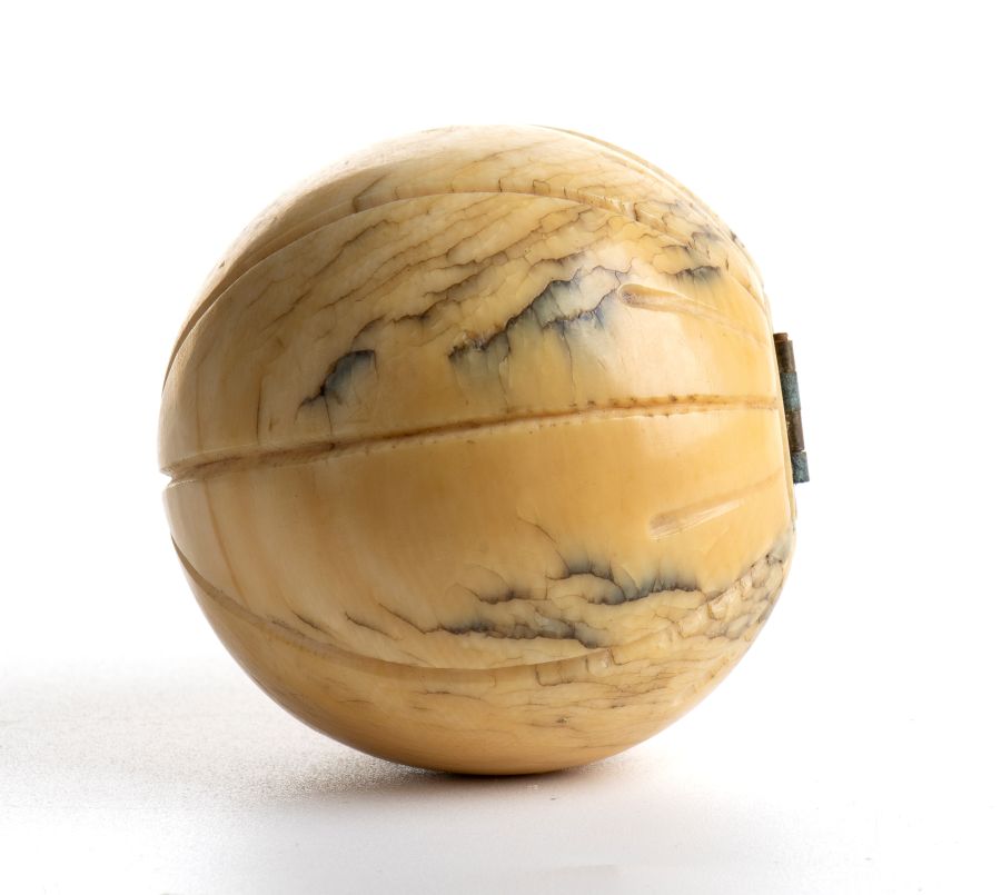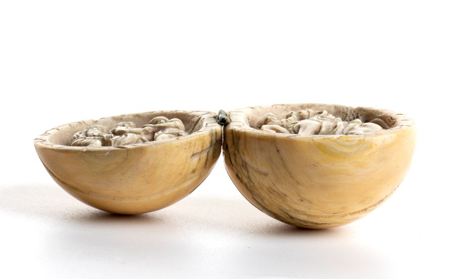 I dittici sferici apribili furono prodotti essenzialmente in Francia e in Germania tra il XVIII e il XIX secolo, riprendendo la tradizione dei Prayer nuts. Il termine inglese Prayer nut o Prayer beads deriva dall'equivalente olandese gebedsnoot, ed è entrato nell'uso comune nel XVIII secolo. L'uso della parola "noce" potrebbe derivare dal fatto che alcune perle erano effettivamente intagliate da noci o noccioli, pratica diffusa nella Germania meridionale medievale. Sono tipicamente apribili a metà e intagliati all'interno di scene religiose cristiane o scene storiche altamente dettagliate e intricate. Le loro dimensioni variano tra i 2 e i 5 cm di diametro, per lo più della stessa forma, decorati all'esterno con trafori gotici intagliati e teste di fiori. Spesso contengono scene centrali raffiguranti episodi della vita di Maria o della Passione di Gesù e, in alcuni casi, contengono iscrizioni intagliate solitamente legate al significato della narrazione. Questo lotto, accompagnato da certificato CITES e da perizia tecnica rilasciata dal Ce.S.Ar. Centro Studi Archeometrici, è disponibile per la vendita solo con spedizioni all’interno della Comunità Europea. Classificazione dello stato di conservazione: **** buono.