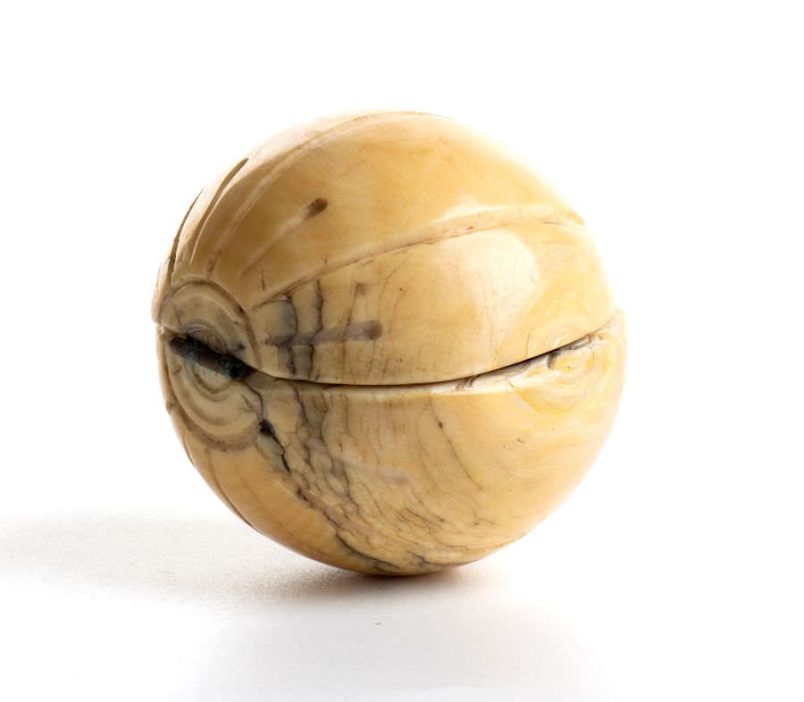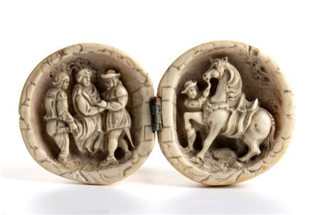 Dittico a sfera pieghevole in avorio Francia, Dieppe (?), XIX secolo Diametro x larghezza aperto: 5,5 x 10,6 cm. Peso: 143 gr