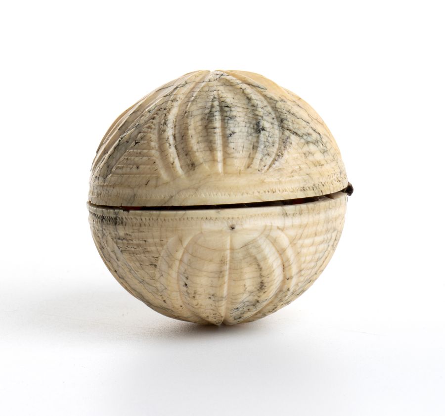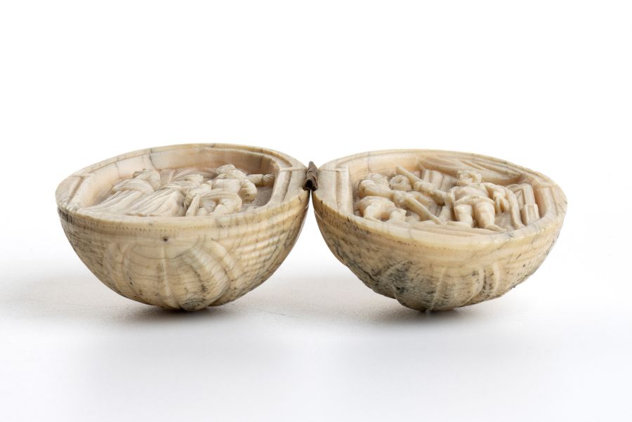 I dittici sferici apribili furono prodotti essenzialmente in Francia e in Germania tra il XVIII e il XIX secolo, riprendendo la tradizione dei Prayer nuts. Il termine inglese Prayer nut o Prayer beads deriva dall'equivalente olandese gebedsnoot, ed è entrato nell'uso comune nel XVIII secolo. L'uso della parola "noce" potrebbe derivare dal fatto che alcune perle erano effettivamente intagliate da noci o noccioli, pratica diffusa nella Germania meridionale medievale. Sono tipicamente apribili a metà e intagliati all'interno di scene religiose cristiane o scene storiche altamente dettagliate e intricate. Le loro dimensioni variano tra i 2 e i 5 cm di diametro, per lo più della stessa forma, decorati all'esterno con trafori gotici intagliati e teste di fiori. Spesso contengono scene centrali raffiguranti episodi della vita di Maria o della Passione di Gesù e, in alcuni casi, contengono iscrizioni intagliate solitamente legate al significato della narrazione. Questo lotto, accompagnato da certificato CITES e da perizia tecnica rilasciata dal Ce.S.Ar. Centro Studi Archeometrici, è disponibile per la vendita solo con spedizioni all’interno della Comunità Europea. Classificazione dello stato di conservazione: **** buono.