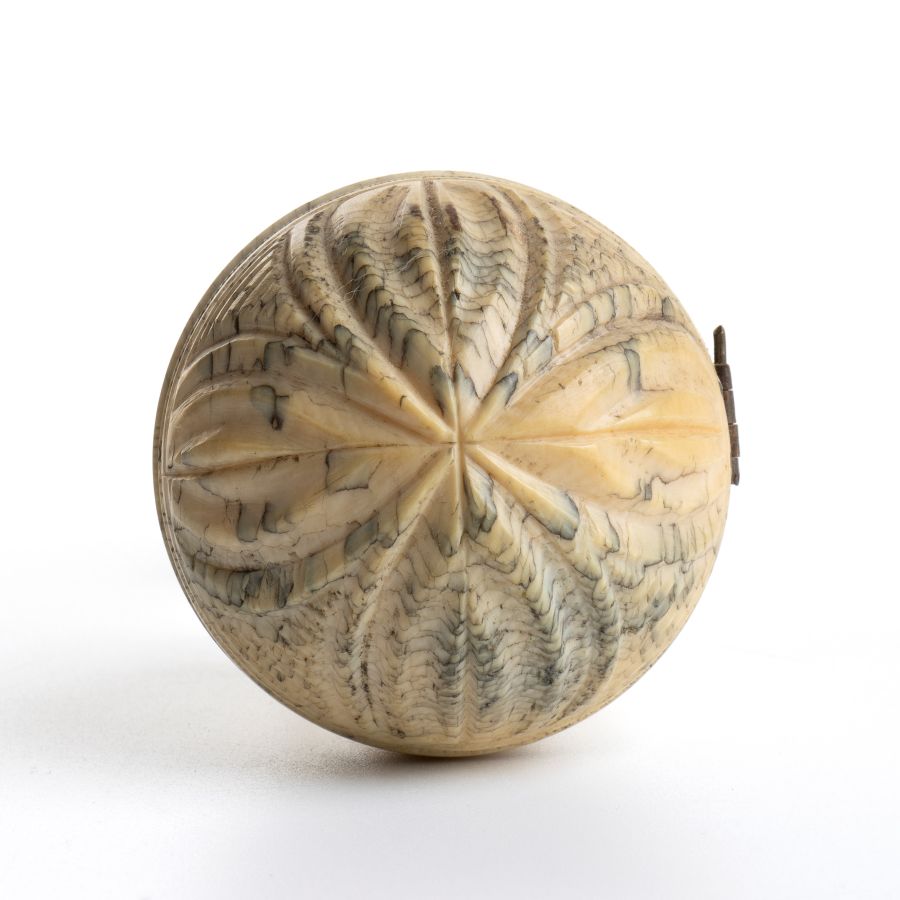 Dittico a sfera pieghevole in avorio Francia, Dieppe (?), XIX secolo Diametro x larghezza aperto: 5,9 x 11,6 cm. Peso: 158 gr