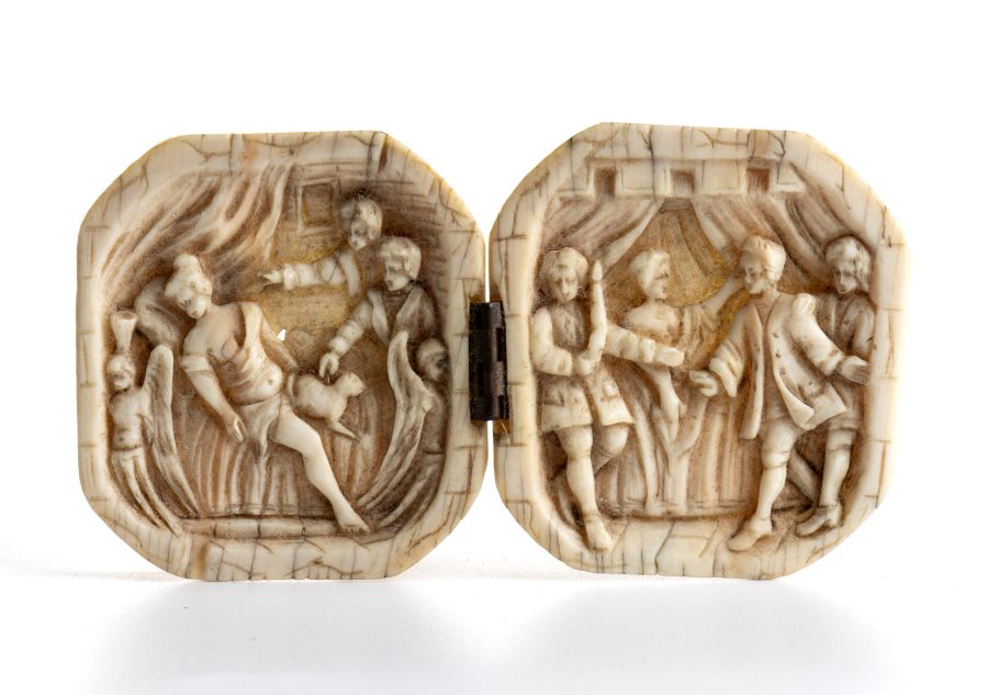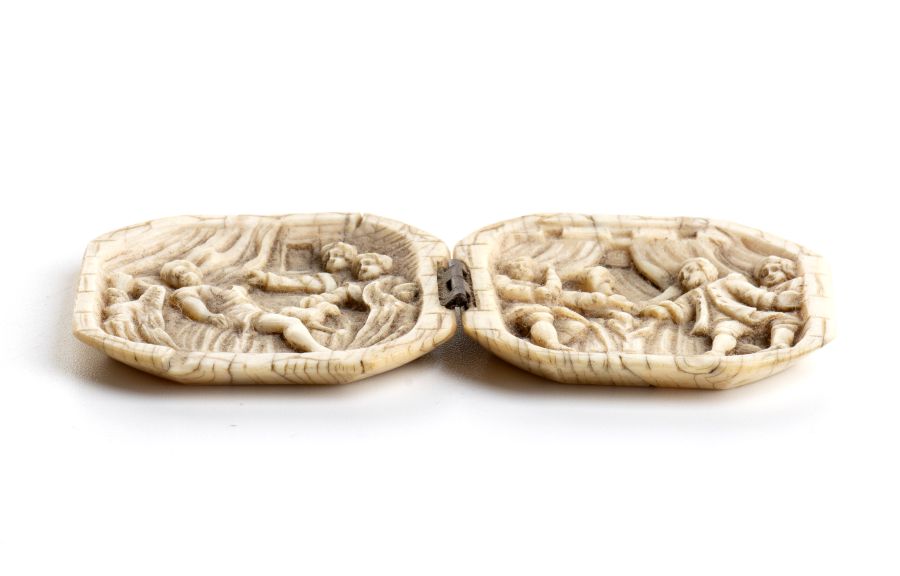 Dittico pieghevole in avorio Francia, Dieppe (?), XIX secolo Altezza x larghezza x profondità: 5 x 4,6 x 1,2 cm. Larghezza aperto: 9,2 cm.Peso: 22,4 gr
