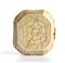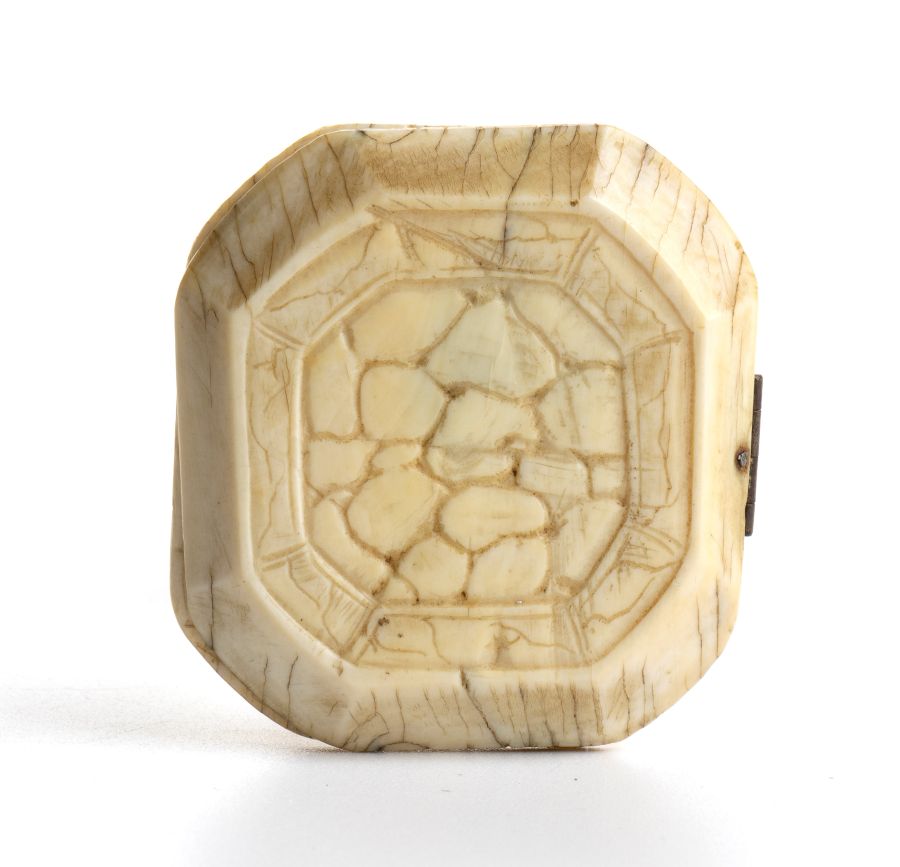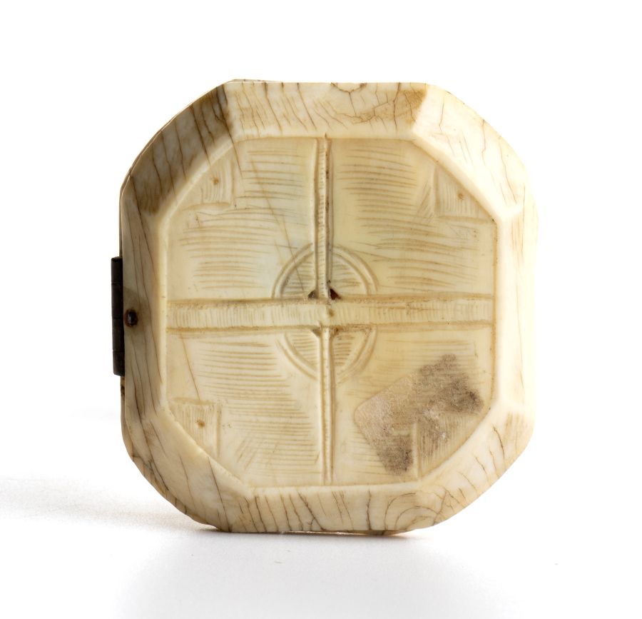Altezza x larghezza x profondità: 5 x 4,6 x 1,2 cm. Larghezza aperto: 9,2 cm.Peso: 22,4 gr in avorio di elefante intagliato (Elephas maximus Linnaeus, 1758 o Loxodonta africana Blumenbach, 1797). La parte esterna completamente liscia, all’interno scene medievali. Nella scena di sinistra è raffigurata una donna sdraiata su un letto con un capretto alle cui estremità vegliano due angeli mentre nella scena di destra la scena continua con la raffigurazione di un gentiluomo contornato da servitori intento ad entrare nella stanza dove giace la donna. Questo lotto, accompagnato da certificato CITES e da perizia tecnica rilasciata dal Ce.S.Ar. Centro Studi Archeometrici, è disponibile per la vendita solo con spedizioni all’interno della Comunità Europea. Classificazione dello stato di conservazione: **** buono.