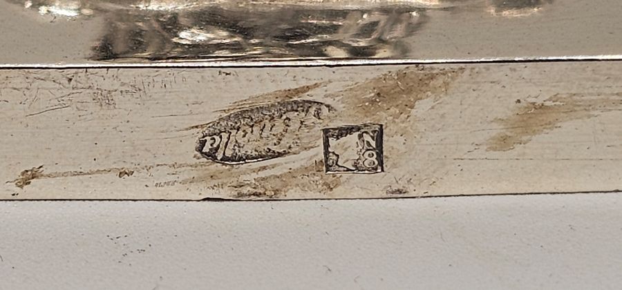 Argento 8000/1000, punzonata con il marchio in uso alla corporazione degli orefici di Napoli per l'argento al titolo di 833/1000 in uso dal 1832 al 1872, argentiere Casolla Giovanni.