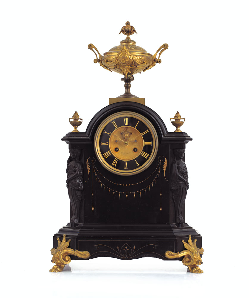 PENDOLA DA TAVOLO IN MARMO NERO E BRONZO DORATO, FINE XIX SECOLO, cassa a plinto cimata da vaso su piedi ferini e sostegni a erme; difetti e da revisionare.