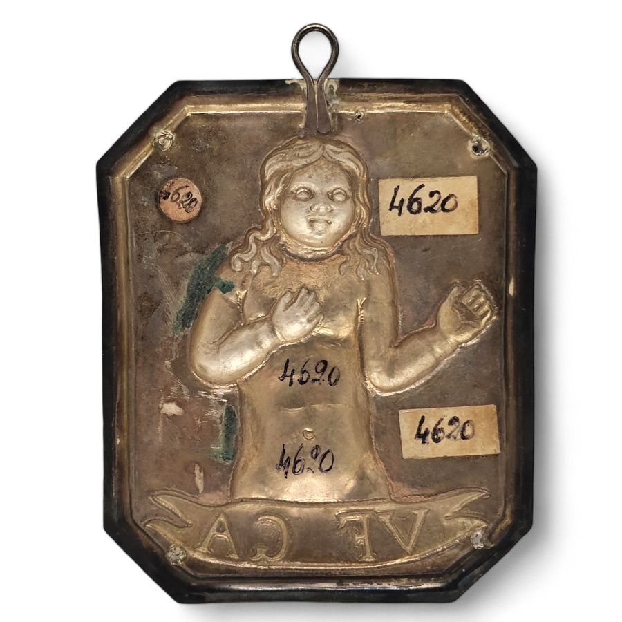 Il lotto in questione è composto da un ex-voto raffigurante un bambino. Probabilmente una richiesta di guarigione di un neonato o bambino, che con questa raffigurazione voleva ricollegare il miracolato o richiedente di miracolo alla figura di Cristo, nell'iconografia del Gesù Bambino, modalità tipica delle tavolette votive, che infatti riflettono un impegno rituale di un richiedente, ossia colui che fa il voto, che può coincidere con il miracolato, colui che ha subito un danno, e la divinità che intercede.