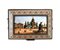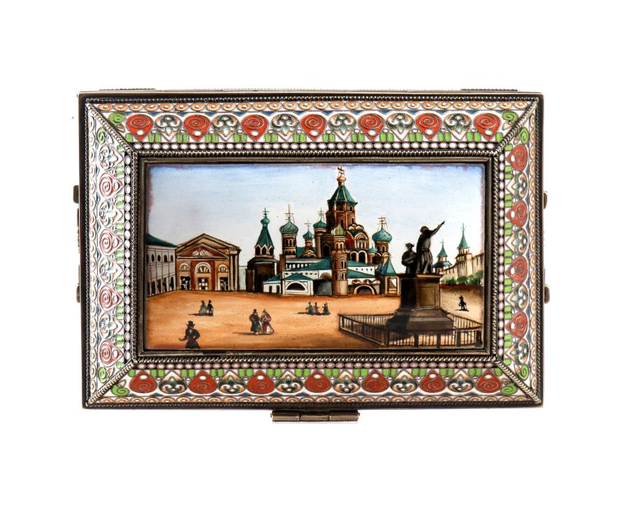 Al centro del coperchio, è presente una miniatura dipinta a mano con smalti policromi sottovetro raffigurante una veduta della piazza Rossa di Mosca, riconoscibile per la chiesa di San Basilio, costruita tra il 1555 e il 1561 su ordine dello zar Ivan Il Terribile, e il monumento a Minin e Pozharsky. La chiesa di San Basilio è celebre per i suoi colori vivaci e la sua struttura architettonica a otto cupole principali, di cui la centrale più alta culminante con croce ortodossa dorata, tutte decorate a motivi a spirale, a scacchiera e a righe. La facciata della chiesa, come visibile anche nella rappresentazione a smalti riportata sul cofanetto, è in mattoni rossi e bianchi, con dettagli oro, ed è ricca di archi.