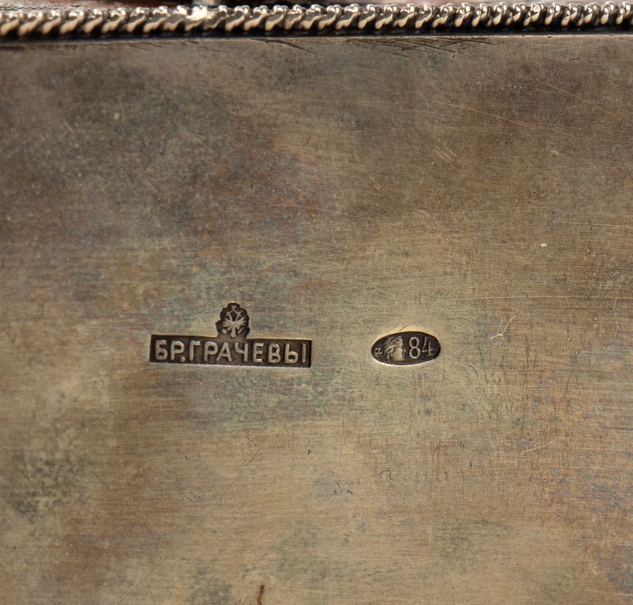 Punzonato con il marchio polifunzionale per l'argento al titolo di 84 kokoshnik al titolo di 875/1000 in uso a San Pietroburgo, dal 1908 al 1926 con il marchio del laboratorio dei fratelli Grachev (1873-1917) in cirillico con l'aquila imperiale.