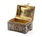 Il cofanetto presenta due manici laterali incernierati a forma di ferro di cavallo e poggia su quattro piedini triangolari anch'essi decorati da smalti policromi.