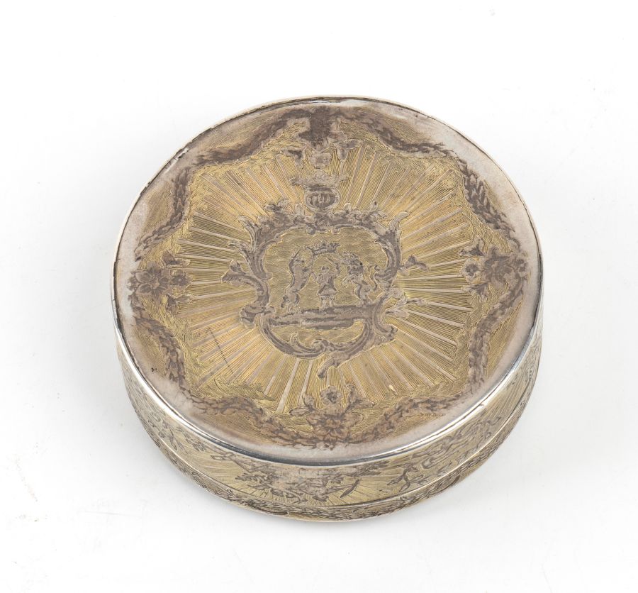di forma rotonda, in argento dorato, decorata con incisioni raffiguranti ghirlande di foglie, mazzi di fiori e allegorie.