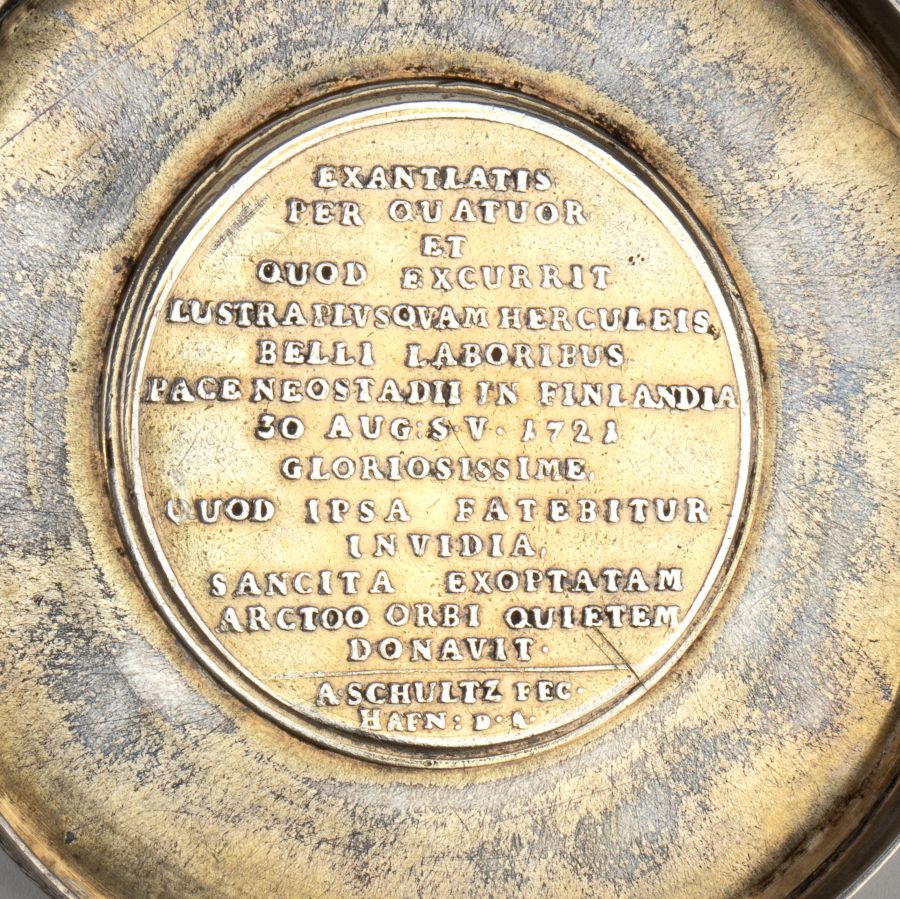Sul rovescio: EXANTLATIS,/ PER QUATUOR,/ ET/ QUOD EXCURRIT,/ LUSTRA PLVSQVAM HERCULEIS,/ BELLI LABORIBUS,/ PACE NEOSTADII IN FINLANDIA/ 30 AUG: S.V. 1721/ GLORIOSISSIME,/ QUOD IPSA FATEBITUR/ INVIDIA,/ SANCITA EXOPTATAM/ ARCTOO ORBI QUIETEM/ DONAVIT. (“Dopo aver compiuto imprese militari, superiori a quelle compiute da Ercole, per quattro quadrenni, e l'ultimo quadrennio trascorso (cioè per 20 anni), concesse la tanto attesa pace al Nord concludendo il sacro trattato a Nystad, in Finlandia, il 30 agosto 1721 (secondo il vecchio calendario), e lo fece con la più grande gloria, che sarà testimoniata dalla stessa invidia)”. А • SCHULTZ FEC • | HAFN: D • А •