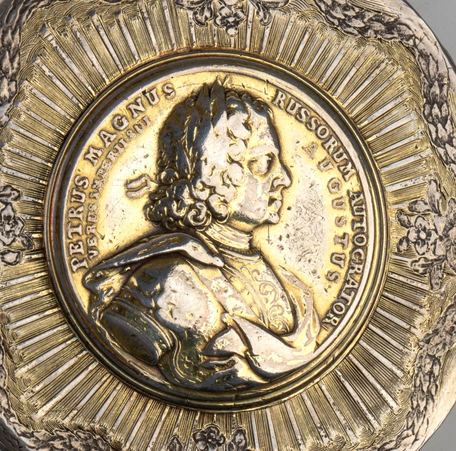 Sul coperchio, contornata da raggi di luce, è presente la medaglia commemorativa della firma del Trattato di Nystad del 1721, raffigurante Pietro il Grande: essa è un'importante opera numismatica emessa per celebrare la vittoria della Russia nella Grande Guerra del Nord e la firma del trattato di pace con la Svezia, dal medaglista danese Anton Schultz (attivo dal 1716 al 1724 a Copenaghen, successivamente a Mosca, † 1736).