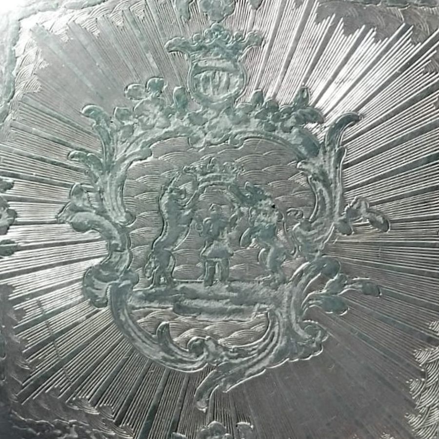 Sul retro della tabacchiera, inserito in una cornice di ghirlande, fiori e raggi di luce similmente al coperchio, è presente uno stemma nobiliare con un motivo araldico elaborato, un leone e un unicorno che reggono o incoronano una figura centrale sotto una corona. Questo tipo di composizione potrebbe essere associato a un simbolismo regio o nobiliare.