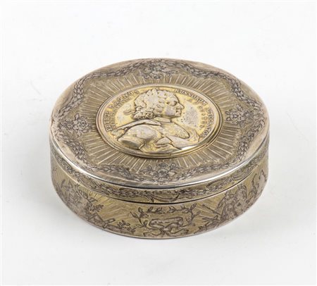 Tabacchiera russa in argento con medaglia commemorativa della firma del trattato di Nystad nel 1721 XVIII secolo Altezza x diametro: 2,5 x 9 cm. Peso: 174 gr.