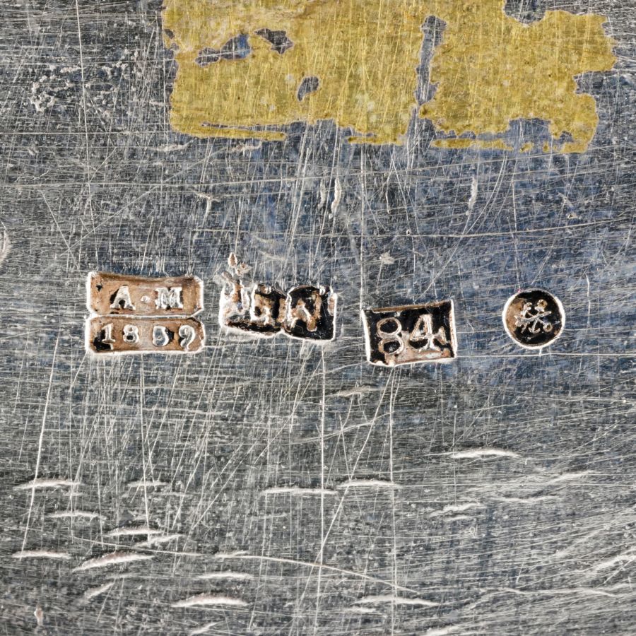 Punzonata con il marchio polifunzionale per l'argento al titolo di 84 zolotniks (875/1000) in uso a San Pietroburgo nel 1852, assaggiatore Aleksandr Nikolayevich Mitin