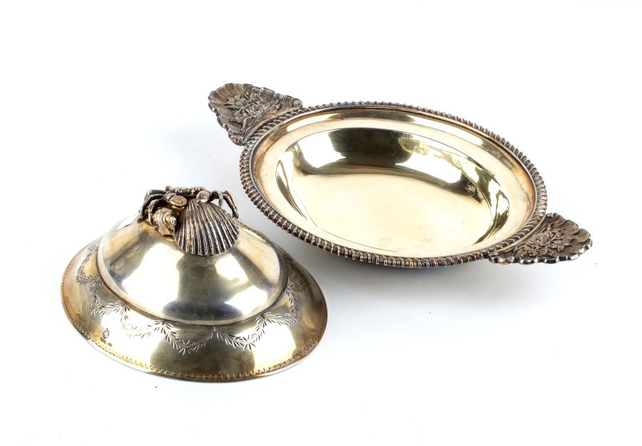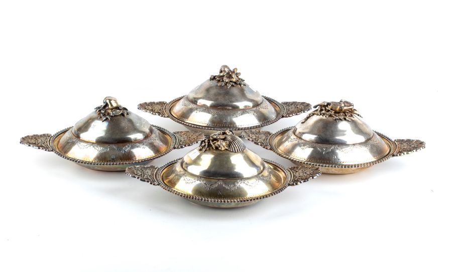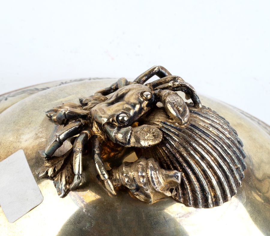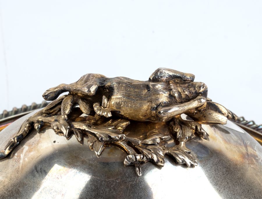 Altezza x larghezza x profondità: 10 x 28 x 16 cm. Peso totale: 2850 gr. di forma ovale in argento vermeille con manici laterali decorati a motivi floreali e prese del coperchi modellata a formare rispettivamente della frutta, un granchio con una conchiglia, un coniglio steso a pancia in su.