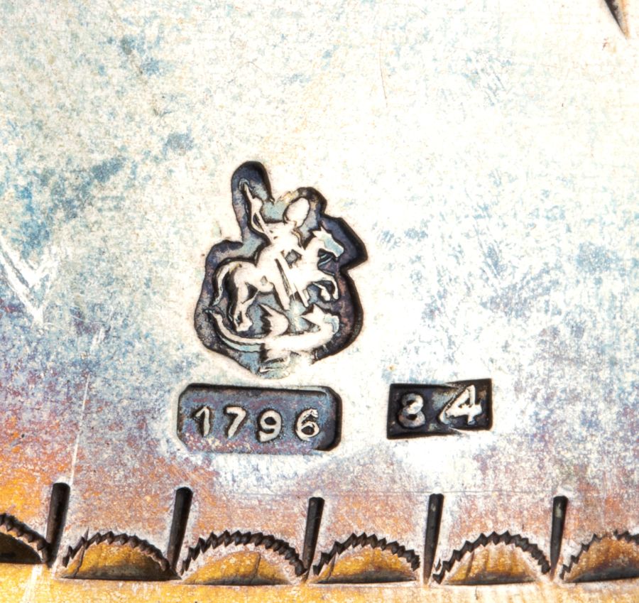 Argento 875/1000, punzonate con i marchi per l'argento al titolo di 84 zolotniks (875/1000) in uso a Mosca nel 1796 (forse contraffatti).