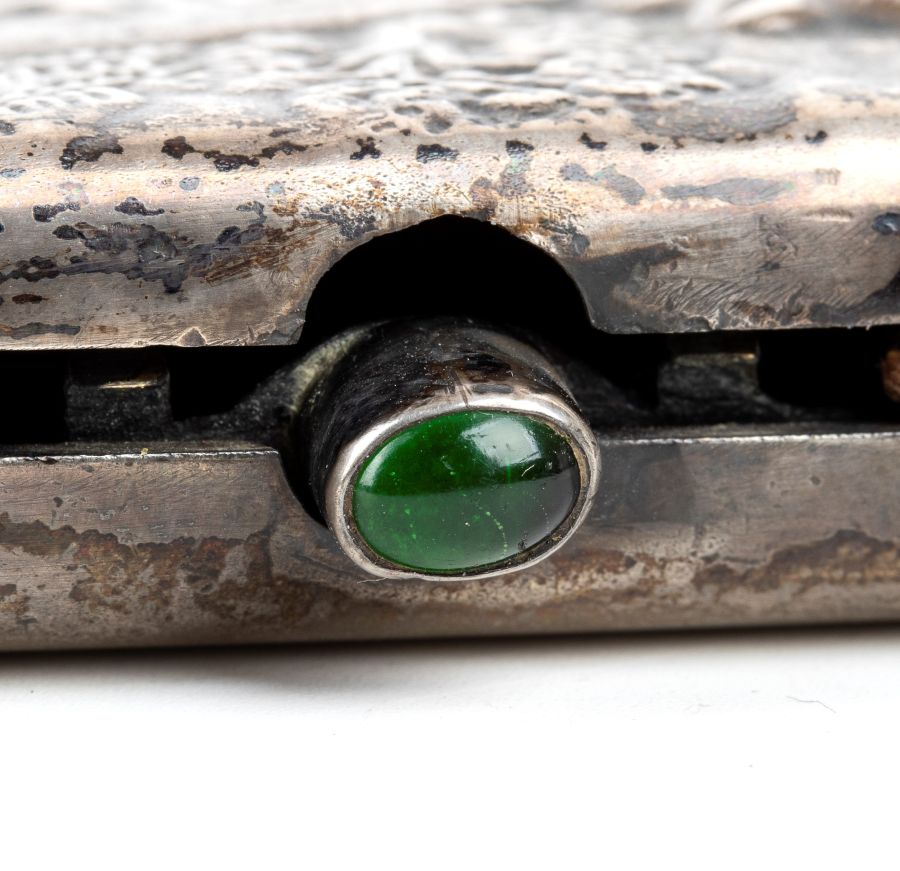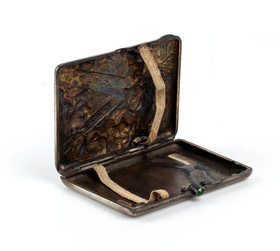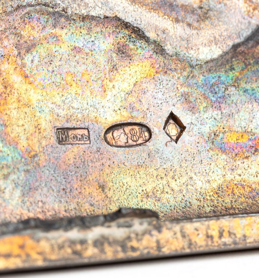 Tabacchiera russa in argento Mosca, 1908-1926 Altezza x larghezza x profondità: 1 x 11 x 8,5 cm. Peso: 204 gr.