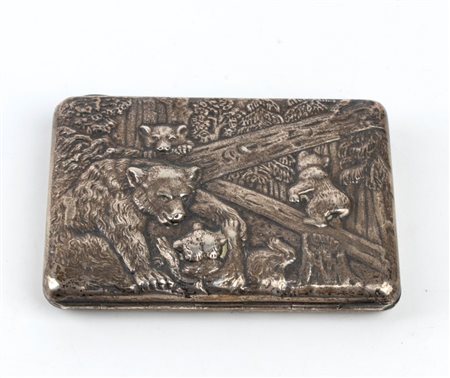 Altezza x larghezza x profondità: 1 x 11 x 8,5 cm. Peso: 204 gr. di forma rettangolare, decorata con scena bucolica raffigurante quattro orsi, la madre con i cuccioli, che giocano in una foresta. Alla chiusura un cabochon di smeraldo.