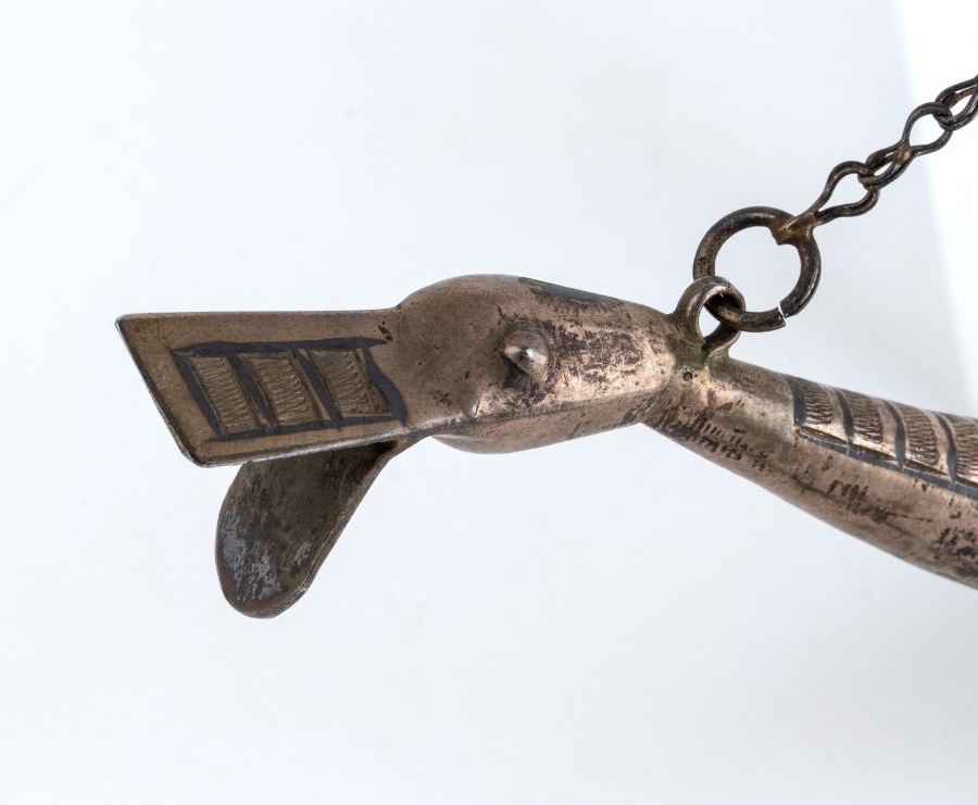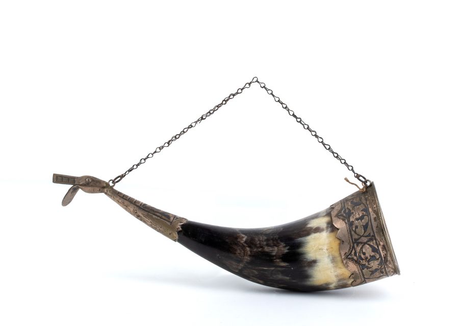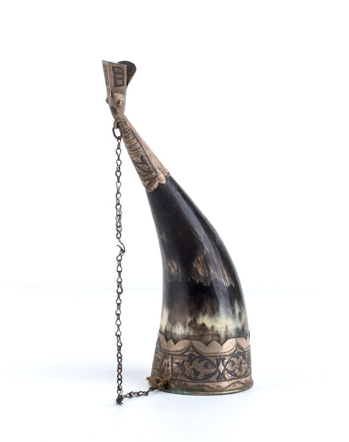La parte aperta del corno, da cui si versa o si beve il vino, è ornata con una fascia in argento modellata sul corno con motivi geometrici che incorniciano elementi a volute. La parte finale modellata anch'essa in argento presenta la forma di testa di papera, con dettagli che includono il becco aperto e gli occhi.
