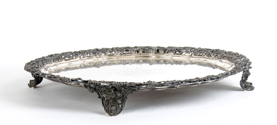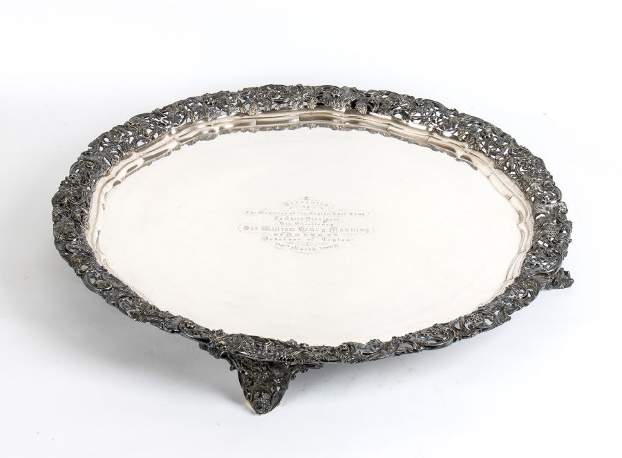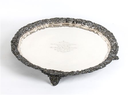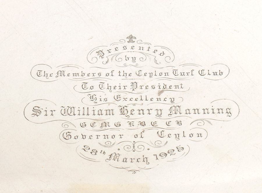 Altezza x diametro: 8 x 63 cm. Peso: 6400 gr circa. di forma circolare poggiante su quattro piedini decorati con maschere di satiri e tralci d'uva, con tesa è riccamente decorata a sua volta con volute vegetali e tralci d'uva. Al centro è riportata la seguente iscrizione: "Presented by the Members of the Centon Durf Club To Their President His Excellency Sir William Henry Manning G C M G H B G C B Gobernor of Ceylon 23th March 1925".
