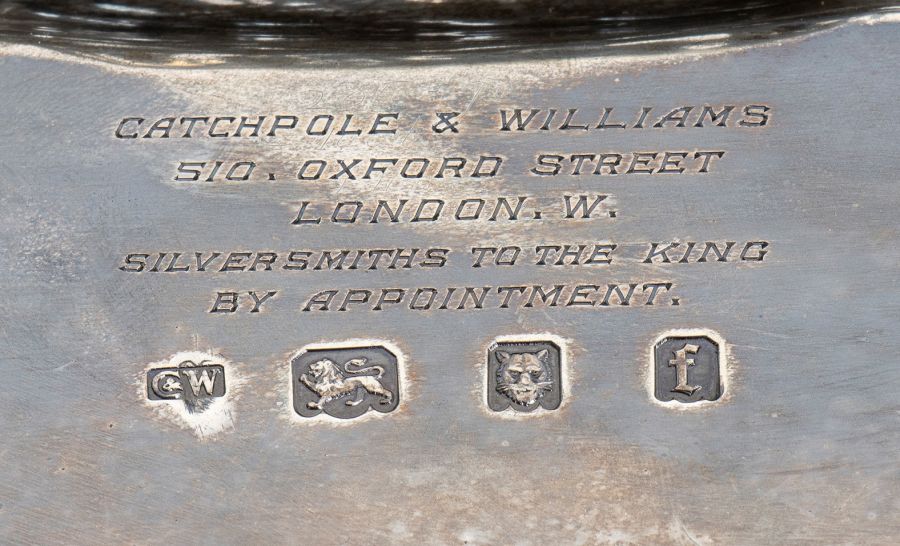 Argento 925/1000, punzonato con la serie completa di marchi per l'argento in uso a Londra nel 1921-22; argentieri Catchpole & Williams. Al Verso l'iscrizione "CATCHPOLE & WILLIAMS - 510 OXFORD STREET - LONDON W. - SILVERSMITHS TO THE KING - BY APPOINTMENT".