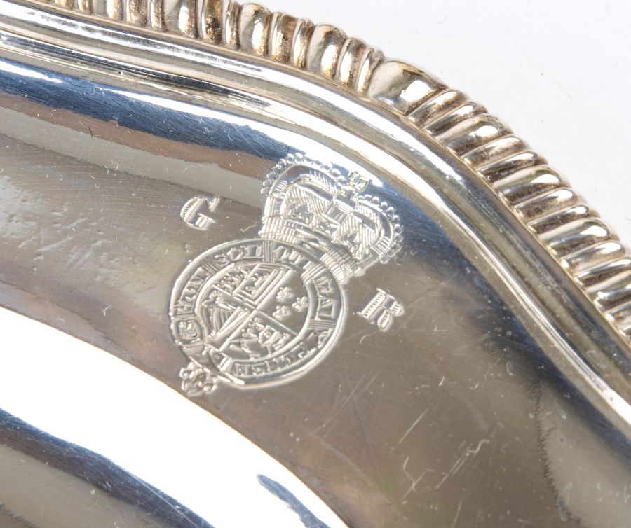 Diametro: 24,5 cm. Peso complessivo: 4990 gr. di forma circolare con bordi godronati applicati e stemma nobiliare inciso; questo modello è stato ampiamente prodotto a partire dal 1740.