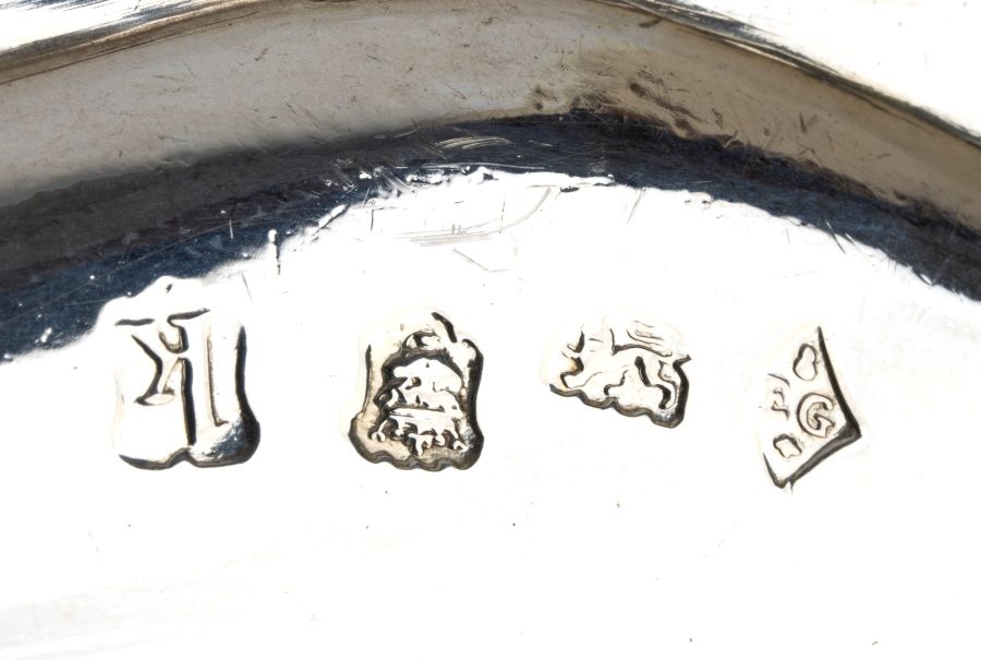 Argento 925/1000, punzonati con la serie completa di marchi in uso a Londra nel 1745-46 e con il marchio dell'argentiere Elisabeth Godfrey, descritta nella suo biglietto da visita come “orafo, argentiere, gioielliere di Sua Altezza Reale il Duca di Cumberland”.