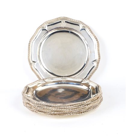 Elisabeth Godfrey Set di 10 piatti da tavola georgiani inglesi in argento Londra, 1745 Diametro: 24,5 cm. Peso complessivo: 4990 gr.