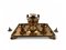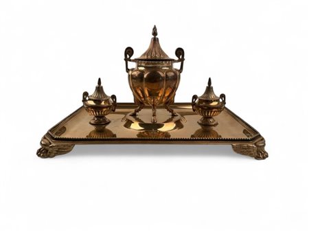 Altezza x larghezza x profondità: 18,5 x 32 x 24 cm. Peso: 1565 gr. in argento dorato, composto da un vassoio rettangolare con bordi perlinati in stile classico e angoli sagomati poggiante su quattro piedini ad artiglio alatii, caratteristiche tipiche delle lavorazioni inglesi del XIX secolo; un contenitore centrale poggiante su tre piedi a zoccolo equino con corpo baccellato, manici laterali, modanatura superiore ad ovuli e coperchio fortemente duomato con presa a fiamma; due contenitori più piccoli ai lati del contenitore principale, che riprendono lo stile decorativo e la proporzione armoniosa dell'intero set.