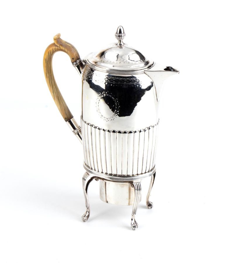 “coffee biggin” o caffettiera Giorgio III in argento 925/1000 su supporto con piedi a zampa ferina con fornelletto, così chiamata a causa dell'uso del bruciatore; “biggins” infatti originariamente caffettiere da campo.