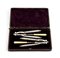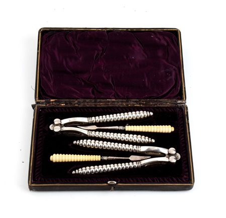 composto da due schiaccianoci e due utensili realizzati in metallo argentato e avorio di elefante tornito (Elephas maximus Linnaeus, 1758 o Loxodonta africana Blumenbach, 1797) contenuti entro custodia originale in pelle.