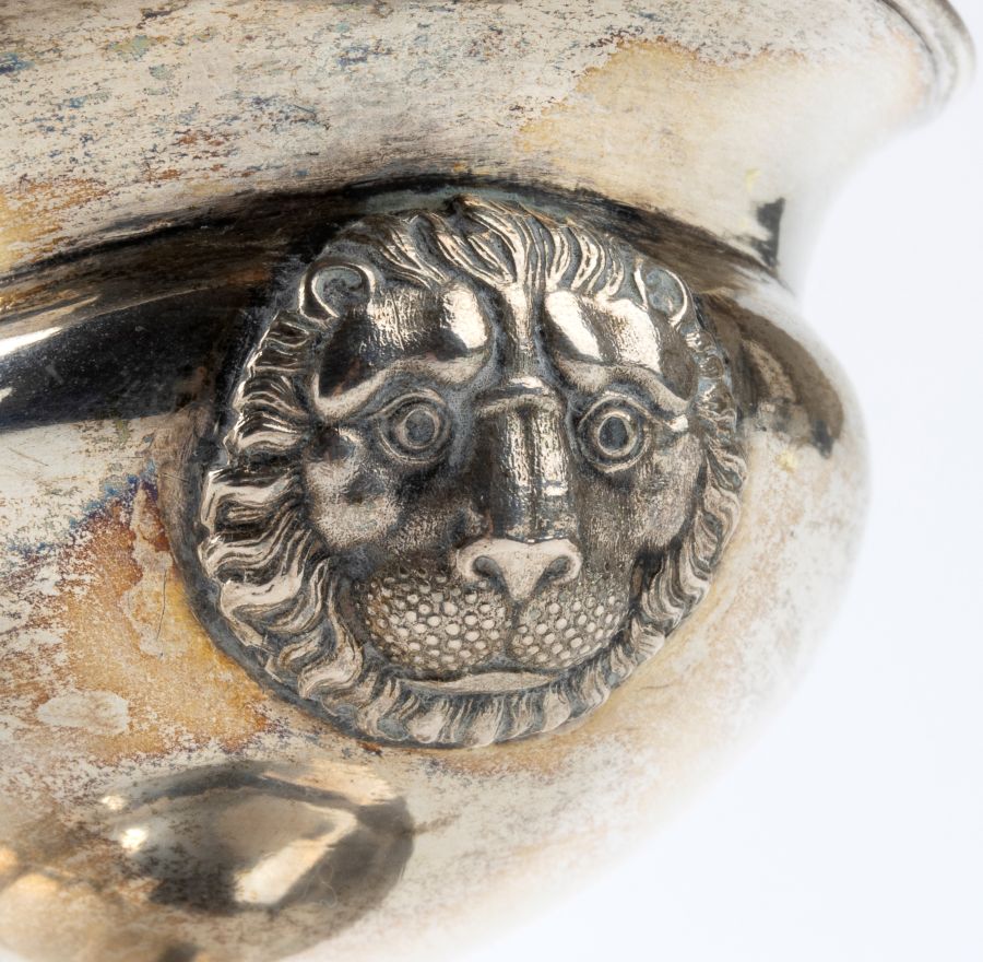 ovale con piede gradinato e interno dorato al mercurio; sui lati teste leonine.
