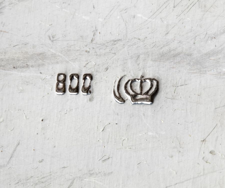 Argento 800/1000, punzonata con i marchi tedeschi per l'argento al titolo minimo di 800/1000 in uso in Germania, dal 1888. Altezza x larghezza x profondità: 7,5 x 13 x 10 cm.