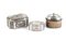 2) di forma ovale con corpo rastremato decorata con una ghirlanda di foglie sul bordo, medesima decorazione riscontrabile sul coperchio, che presenta una presa a forma di pigna;.