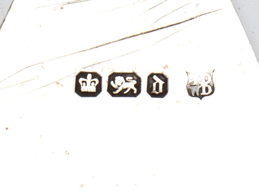 Argento 925/1000, punzonata con la serie completa di marchi in uso nella città di Sheffield nel 1896-97 e con i marchi degli argentieri John Deakin & William Deakin. Questo lotto, accompagnato da certificato CITES e da perizia tecnica rilasciata dal Ce.S.Ar. Centro Studi Archeometrici, è disponibile per la vendita solo con spedizioni all’interno della Comunità Europea.